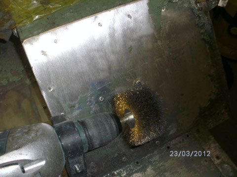 Anschließend habe ich auch die Oberseite des Heckbodys entlackt. Wieder zuerst mit Lackabbeitzer angelöst und dann mit Drahtbürstenauf-sätzen an der Bohrmaschine blank geschliffen. Damit der Lackabbeitzer nicht vorzeitig antrocknet, habe ich alle Stellen mit Folie abgedeckt.