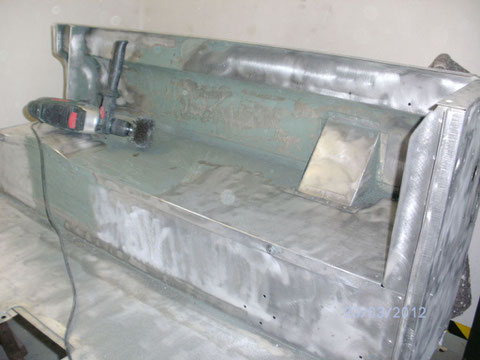 Zuerst habe ich die Unterseite des Heckbody entlackt und die von der Kontaktkorrossion zerfressenen Stellen mit Alu-Spachtel ausgebessert. An den Stellen, wo die Quertraversen aus Stahl verlaufen, hat der Alufraß gewütet.