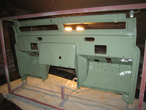 Die Spritzwand ist voller Kanten, Ecken und Winkeln. Ein zufriedenstellendes Ergebnis ist mit der Rollen nicht hinzubekommen. Daher kam die Spritzpistole zum Einsatz. Das Ergebnis lässt sich sehen. Zwar keine High End Lackierung, aber das muss bei einem Landy auch nicht sein. Außerdem leidet der Lack bei einem Land Rover bei artgerechter Haltung eh am meisten.So muss das Ergebnis hingenommen werden.